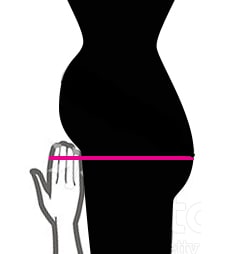 پاهای خودتون رو جفت کنید متر رو در برجسته ترین قسمت باسن قرار بدید و اندازه گیری کنید. در صورت داشتن شکم مطابق عکس به اندازه برامدگی شکم با انگشت فاصله ایجاد کنید.